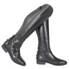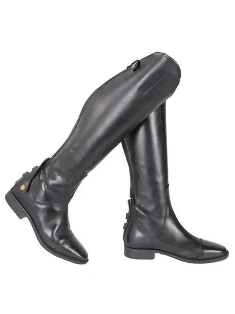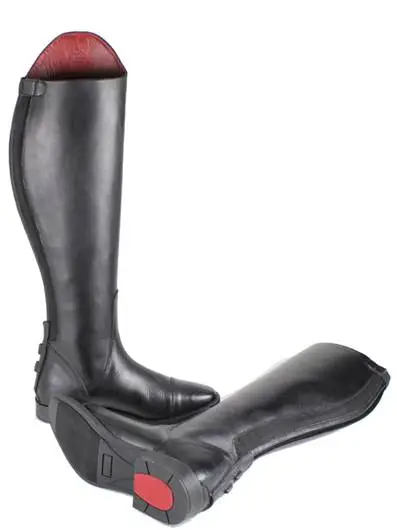 Lang ridestøvle i et elegant design, som gør dem anvendelige i alle discipliner. Fremstillet i blødt og smidigt ægte læder og forsynet med en stabil skridsikker gummisål med rød detalje, og foret med ægte læder i rødt. Lynlås ned bagpå, hvor der også er placeret en praktisk elastisk indsats, som gør pasformen fleksibel. Elegant formet skaft med smallere ankel og høj bue som “strækker benet optisk”. Den nederste del af lynlåsen dækkes af en praktisk læderklap – med rødt læder på indersiden – og forsynet med spore- leje på ydersiden.