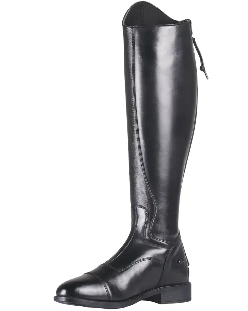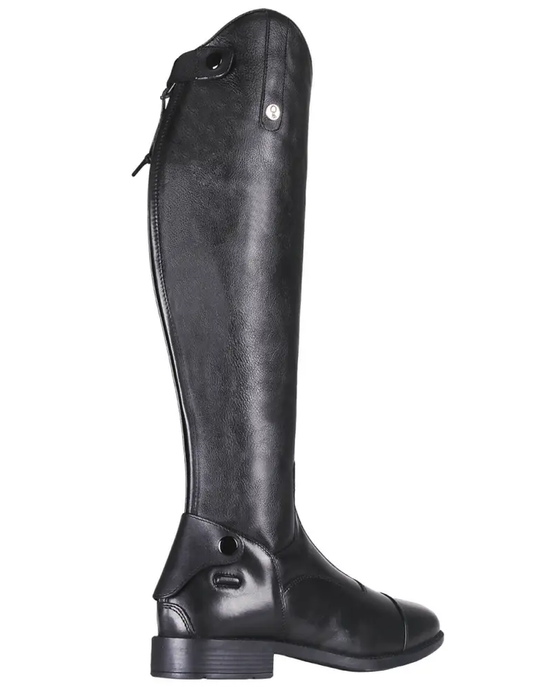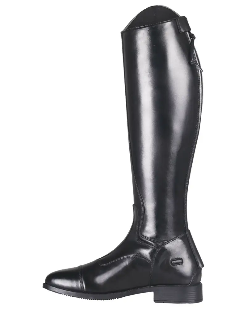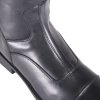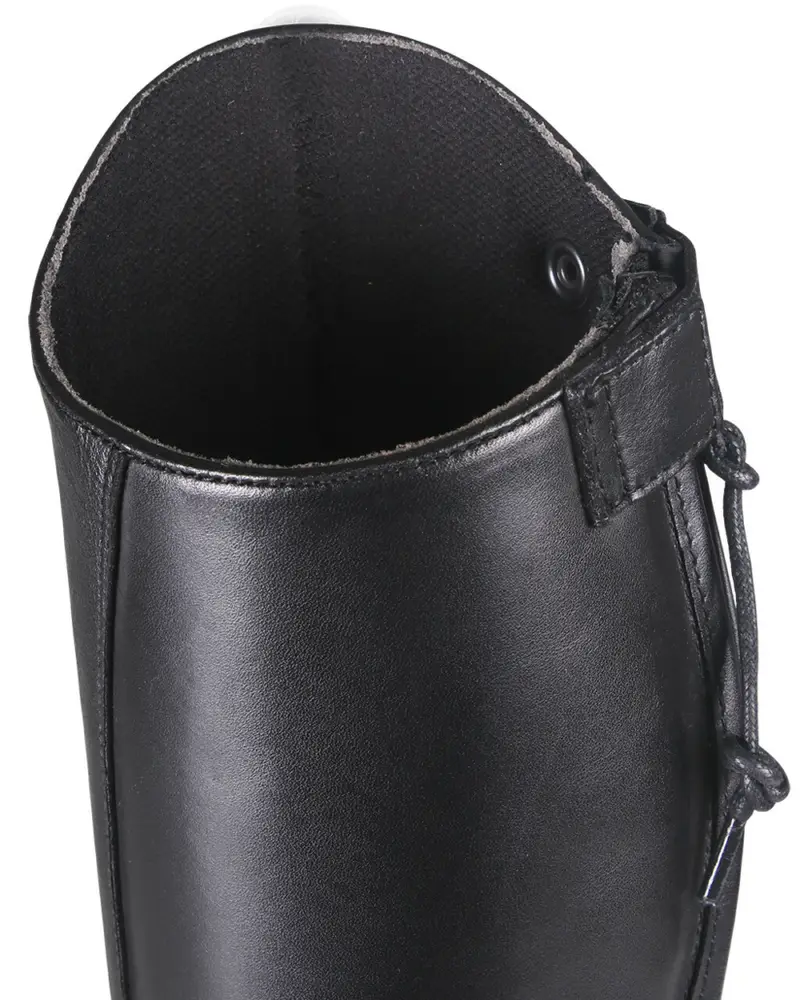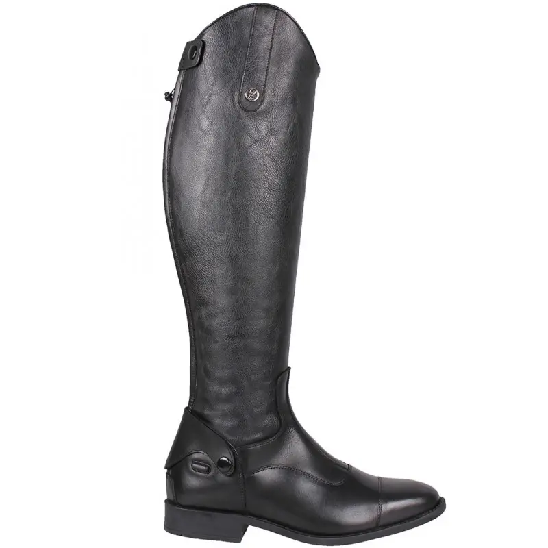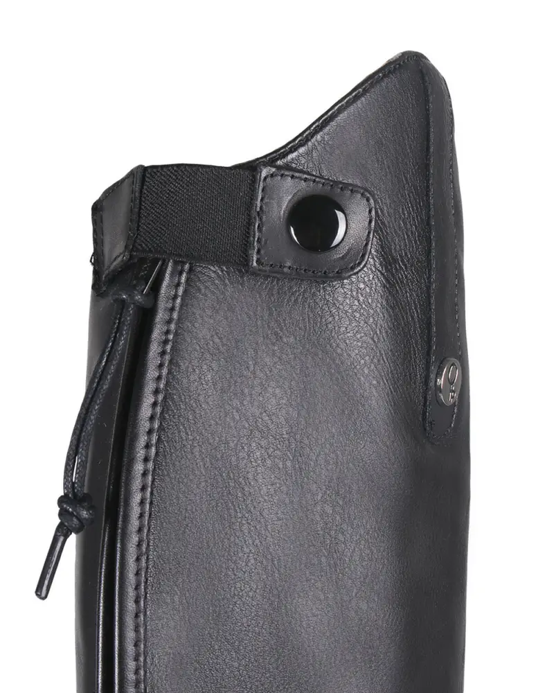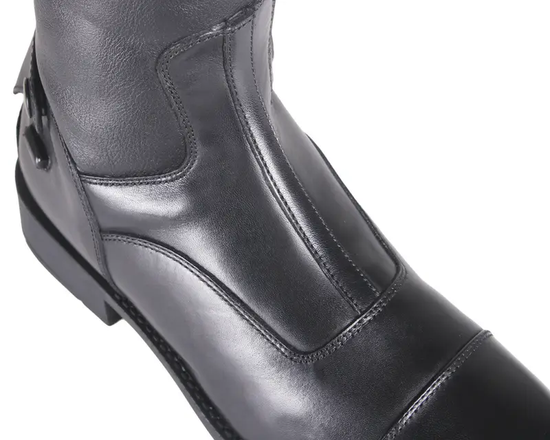 This riding boot has a cool look due to the tough texture of the material on the shaft and the lace of the zipper. The calf is made of elastic artificial leather, the lower part is made of genuine leather.
