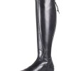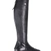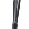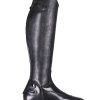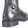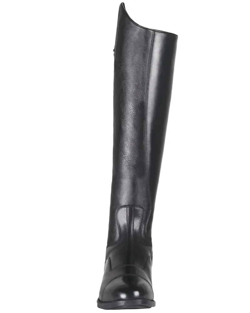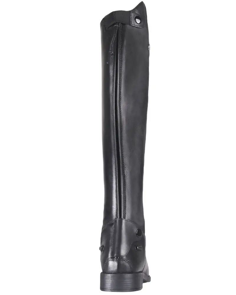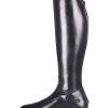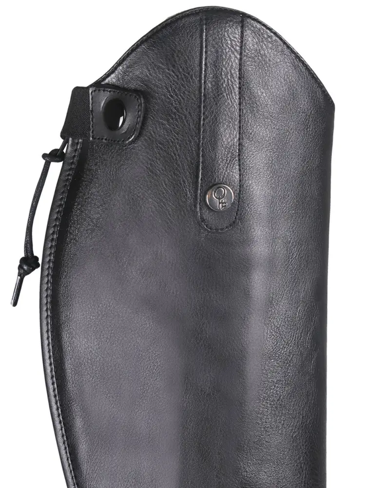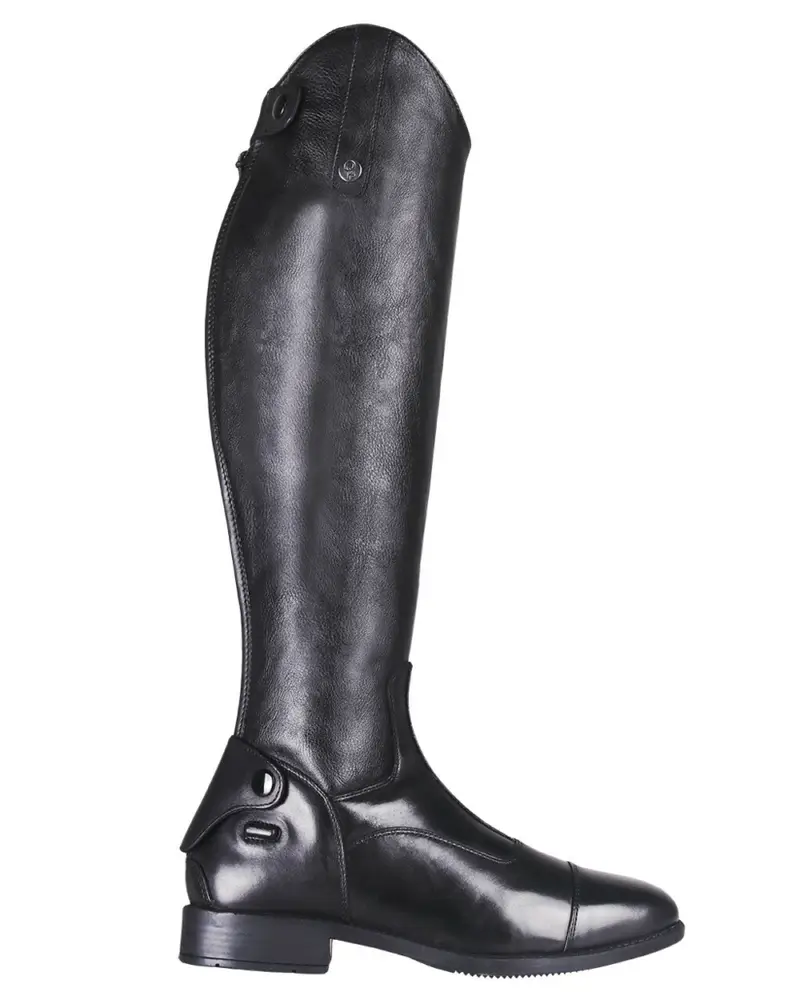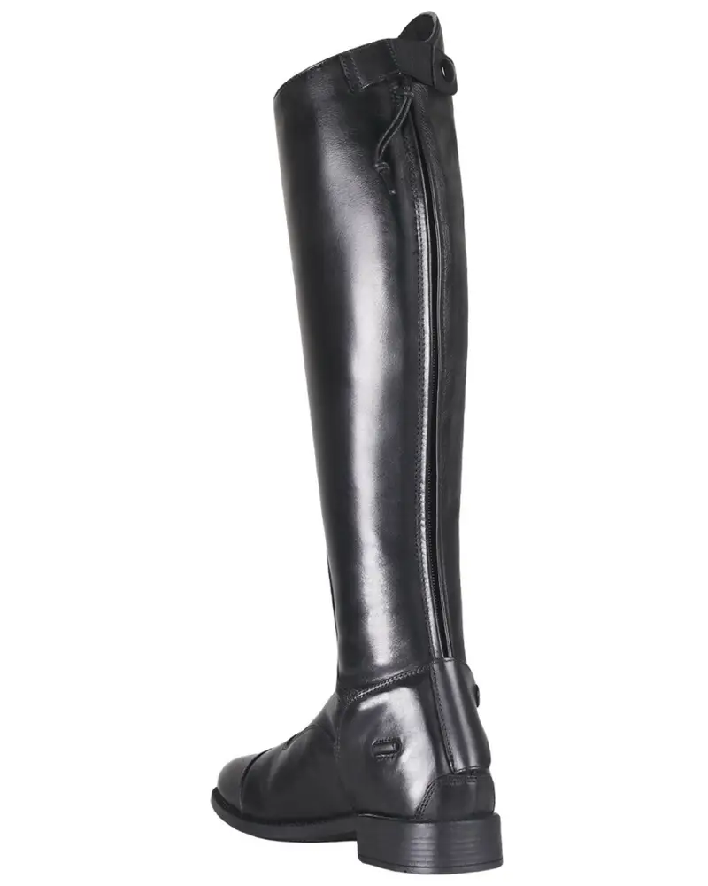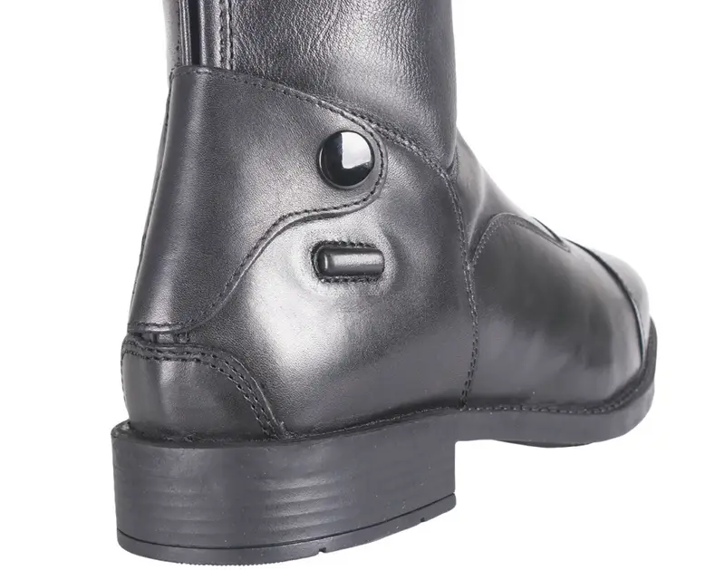 This riding boot has a cool look due to the tough texture of the material on the shaft and the lace of the zipper. The calf is made of elastic artificial leather, the lower part is made of genuine leather.
