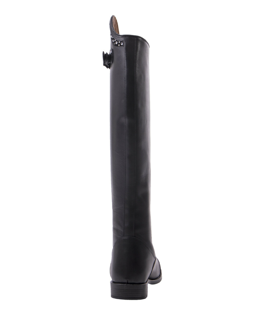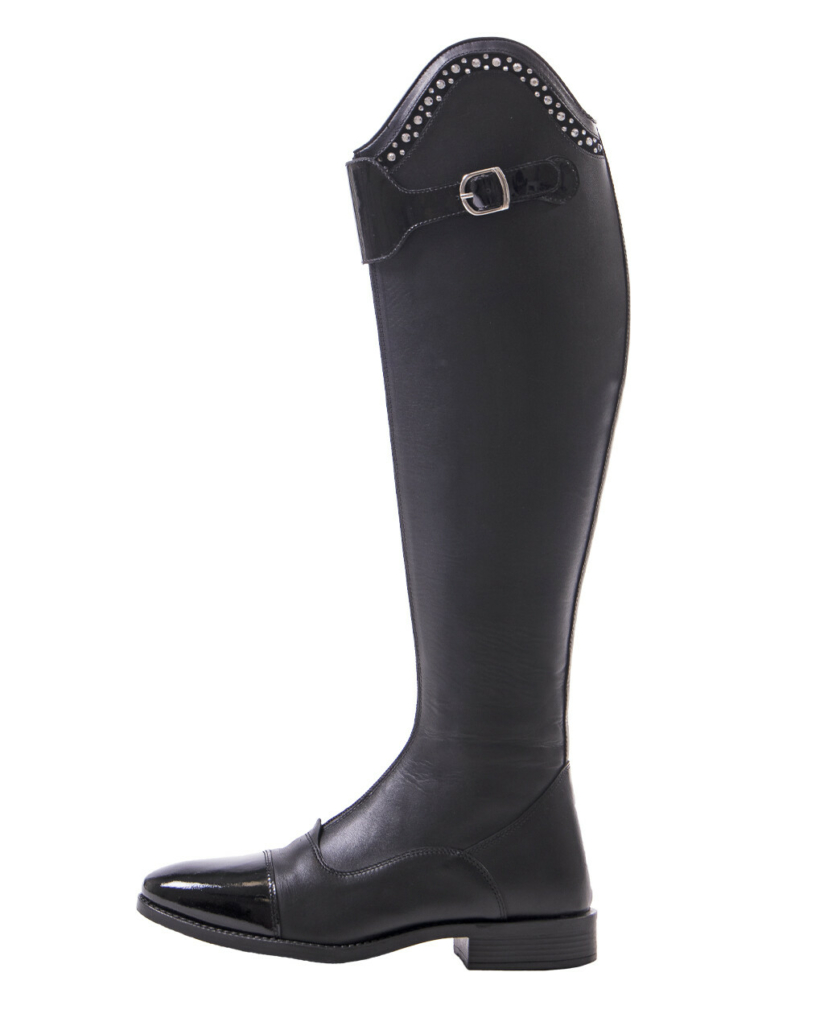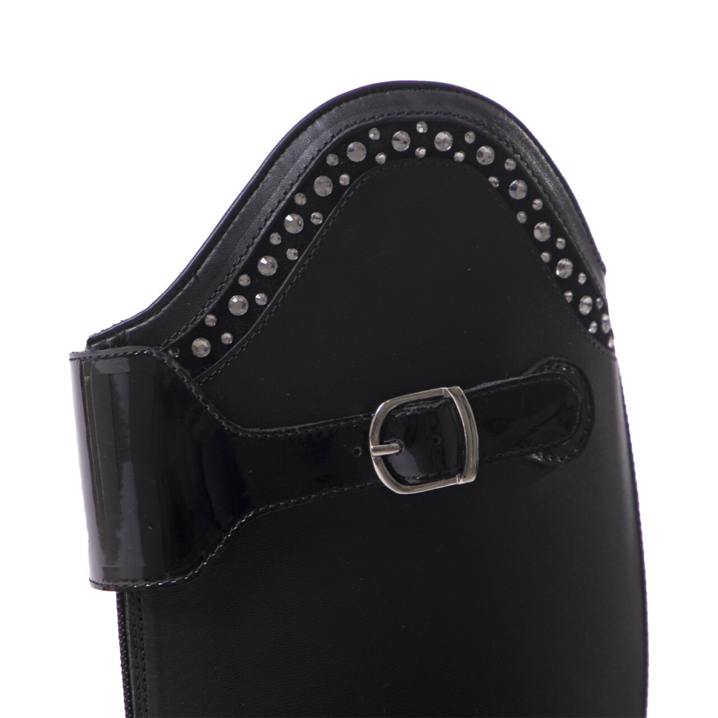 The top of the boot is decorated with rhinestones. The toe of the boot is decorated with patent leather. In short; with this boot you will shine during your training or competition.