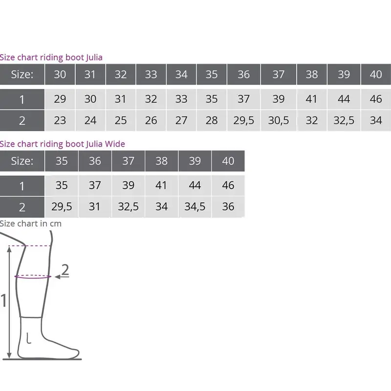 Denne støvle har et special størrelses skema for børn og unge ryttere på samme måde som voksenstøvler med 2 forskellige lægvidder og 2 højder.