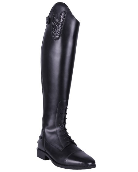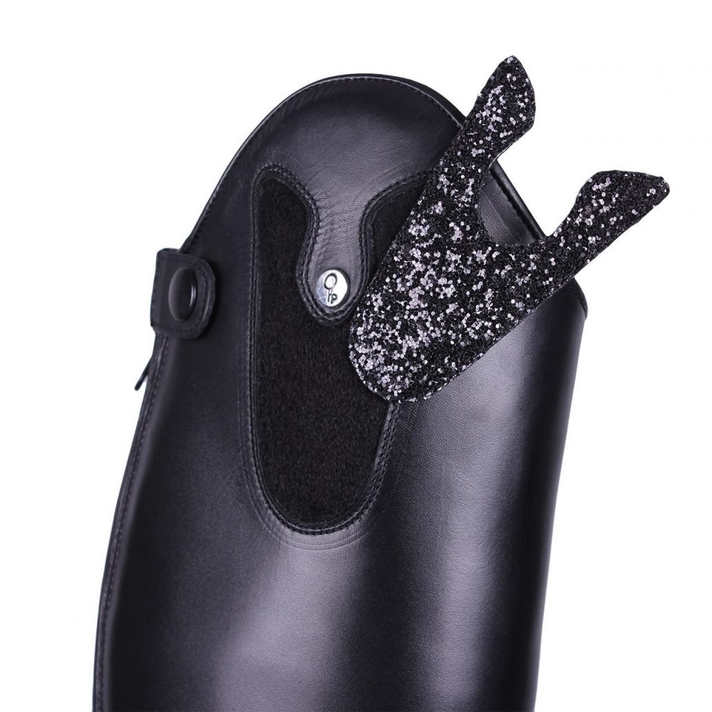 Adjust this riding boot to your style! The top features Velcro so decorative designs can be attached to the riding boot. The boot comes with a glitter design. Other designs are available separately. The riding boot features a zipper with elastic insert in the back and an elastic lace in the front.