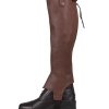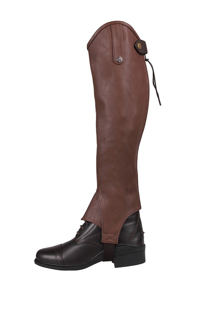 Denne leggin har et råt look grundet den ru materialetekstur på skaftet og snøren på lynlåsen. Ydersiden er fremstillet af elastisk kunstlæder med kalveskind på siden ind mod hesten.