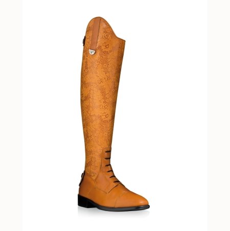 Boot in soft leather with flowers or fantasy print, with back zip and back elastic. Fully-sewn leather sole. Back button and double-position spur rest.